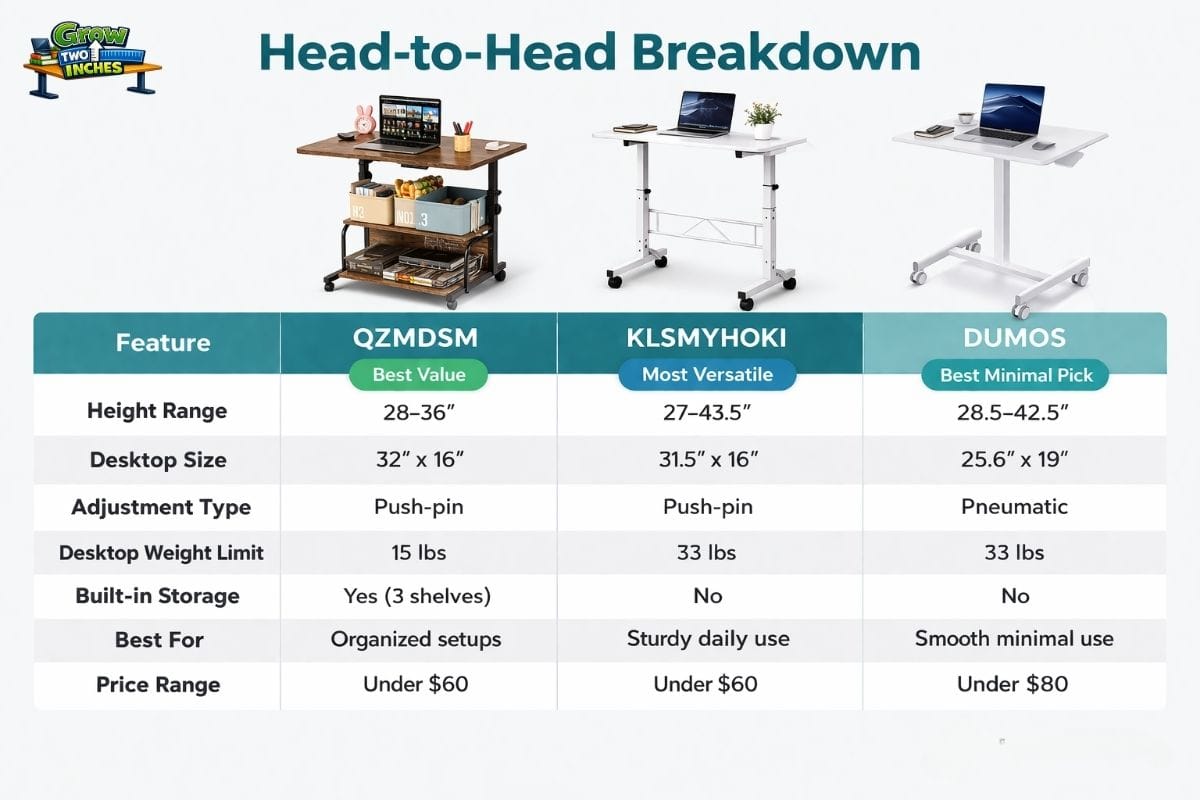 Heavy-duty steel frame. Double-support construction under the desktop. Four lockable wheels. Height range from 27 to 43.5 inches, which is a genuinely impressive range that covers sitting, standing, and every height in between. Desktop is 31.5 inches by 16 inches.